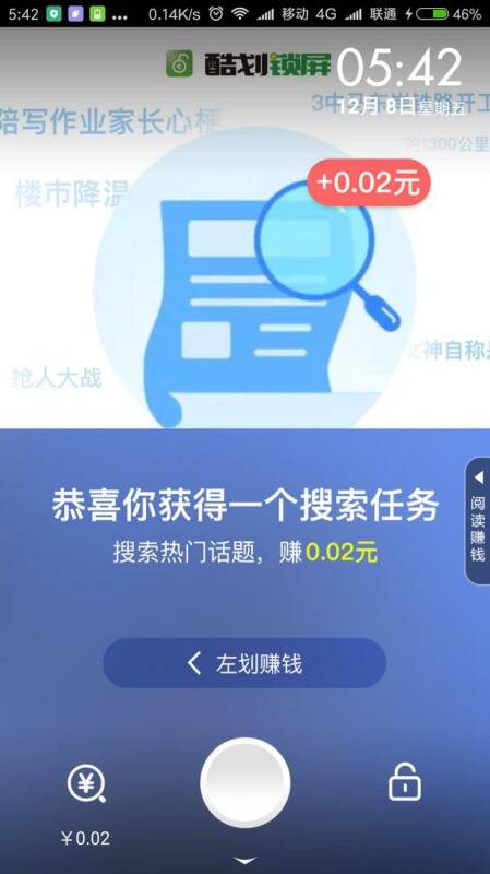 然后手机锁屏,解锁开屏就可以赚到0.02元了,就是这么容易。