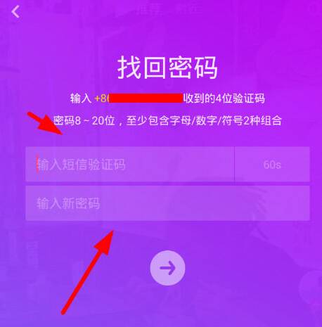 3、最后在找回密码的页面里,通过输入手机获得的短信验证码,就可以重新设置密码,来取代自己忘记的密码了。